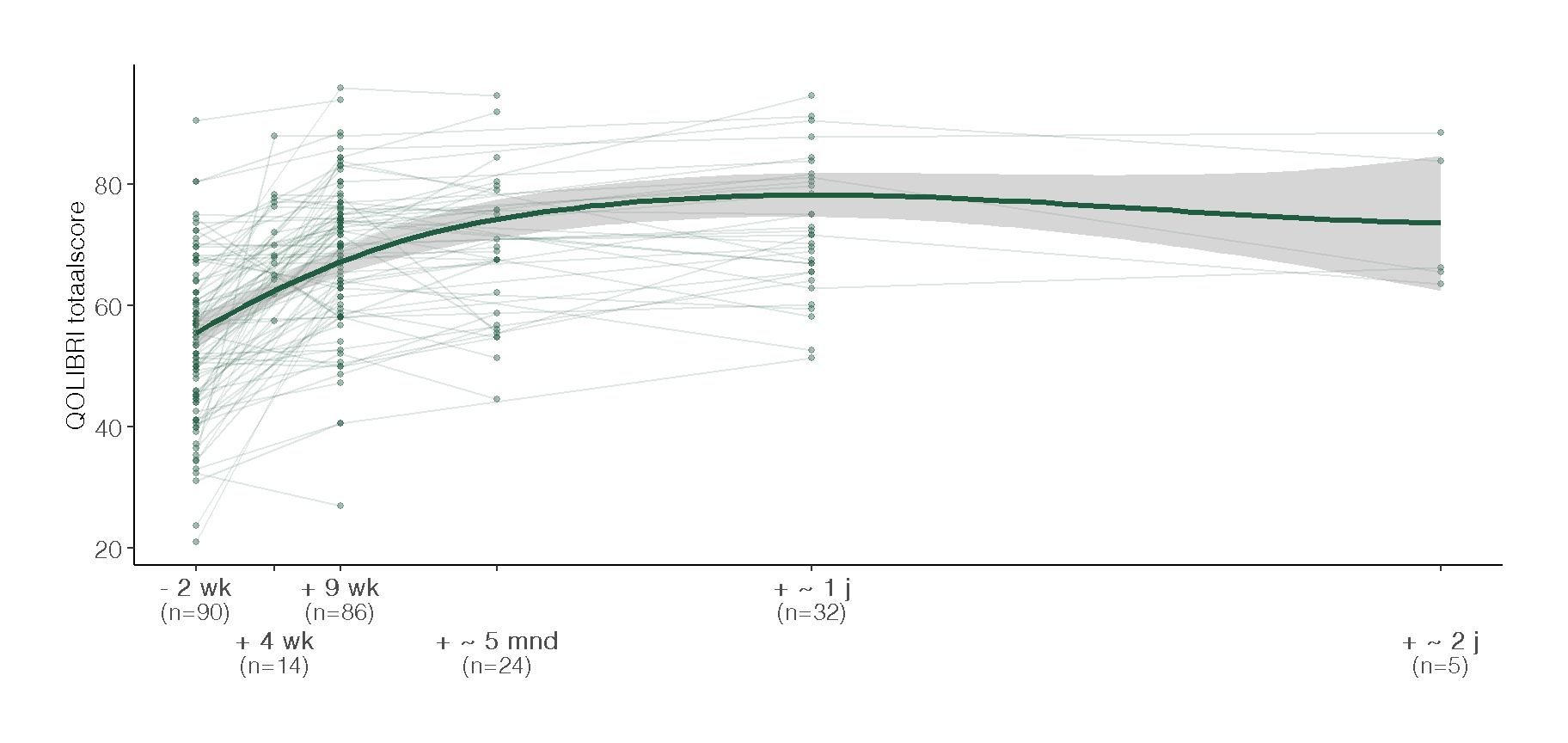 In de onderzoeksgroep bedroeg de gemiddelde QOLIBRI-score bij aanvang (week 1) 54.1 (SD = 13.1). Drie weken na de intensieve behandelweek, in week 7, was deze gestegen naar 70.8, wat neerkomt op een toename van 16.7 punten ten opzichte van de beginsituatie.