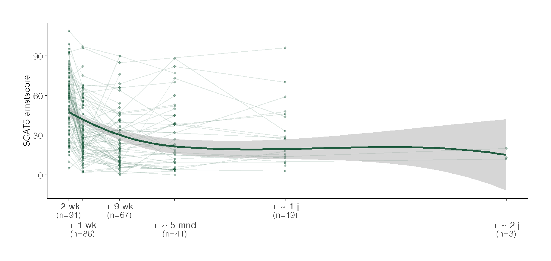 Het verloop van symptoomernst over tijd is weergeven in Figuur 2. Zie Paragraaf 4.2 voor een toelichting op de tijdsaanduidingen op de x-as. Tabel 2 presenteert de gemiddelde SCAT5-totaalscores per behandelweek, inclusief het verschil ten opzichte van baseline. Voor de analyse van veranderingen in scores tussen elk tijdspunt en baseline is gebruikgemaakt van gepaarde t-toetsen.