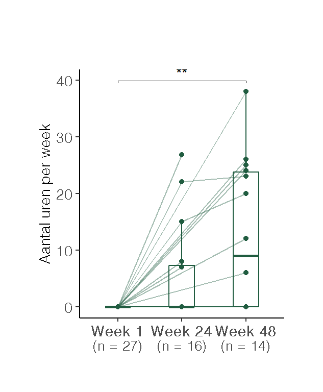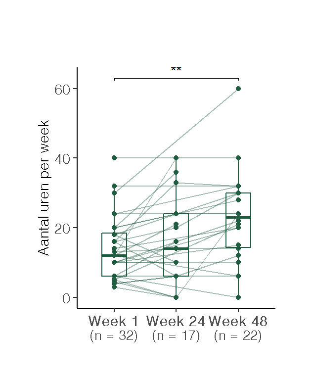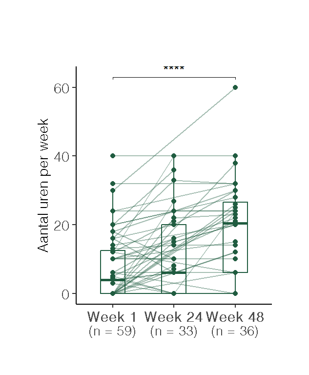 Wanneer gestratificeerd werd naar werksituatie op baseline, bleek dat bij de deelnemers die reeds vóór de start van het behandeltraject werkzaam waren (n=32), het gemiddeld aantal gewerkte uren per week toenam van 14.1 uur op week 1, naar 16.6 uur op week 24, en verder naar 22.8 uur op week 48 (Figuur 3 b).