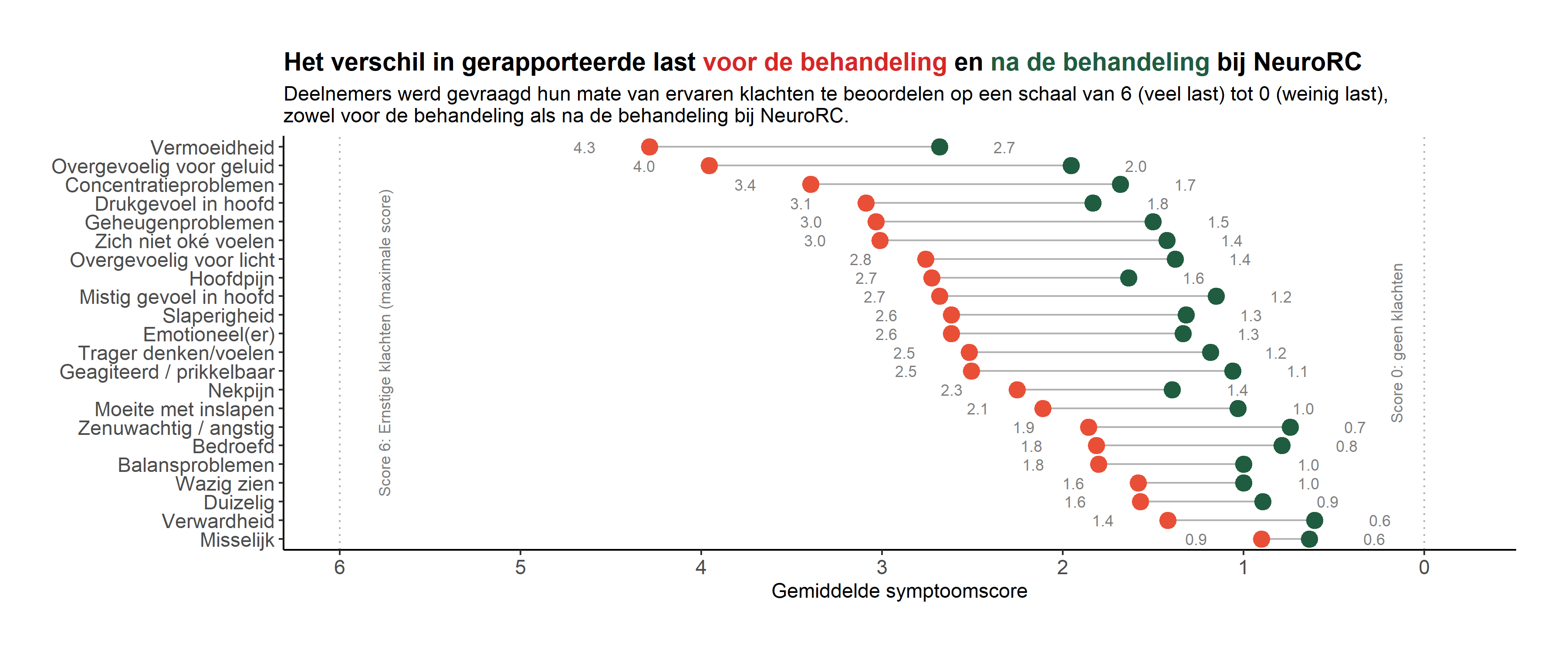 De rode punten geven de gemiddelde score vóór de behandeling bij NeuroRC aan, en de groene punten laten de gemiddelde score ná de behandeling zien. Elk lijntje verbindt de scores van een specifiek symptoom.