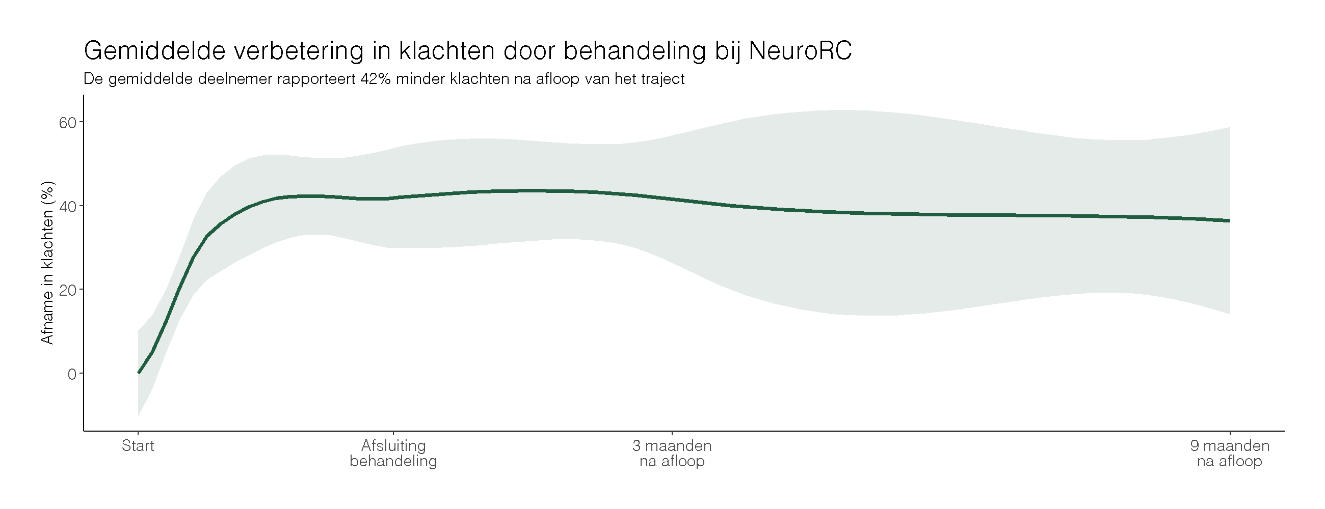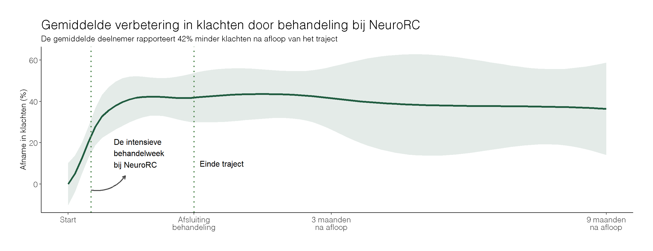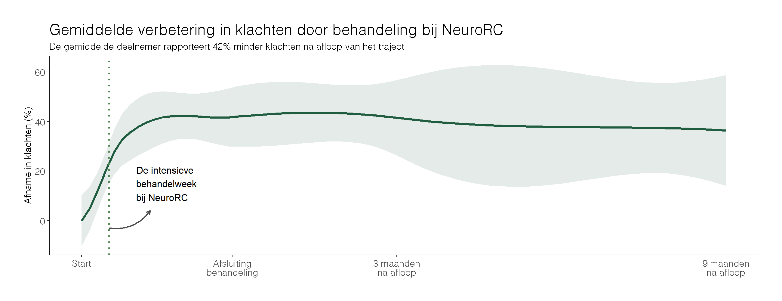 Je ziet dat naar aanleiding van de intensieve behandelweek de grootste verbetering in mate van ervaren klachten optreed. De groene lijn laat de gemiddelde verbetering zien van de 91 deelnemers die het traject bij NeuroRC hebben doorlopen. De schaduw er om heen geeft een mate van spreiding aan.